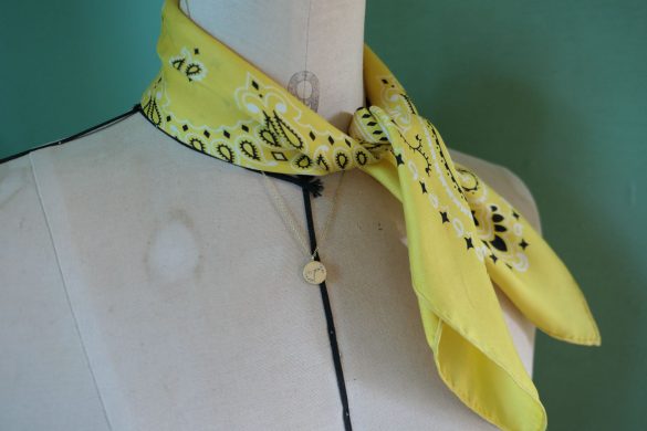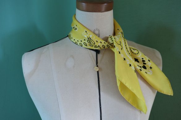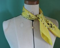 このスカーフは、いわゆるネッカチーフと呼ばれる、首に巻くのに適した大きさのもので、黄色地に黒と白でペーズリー模様が入っています。