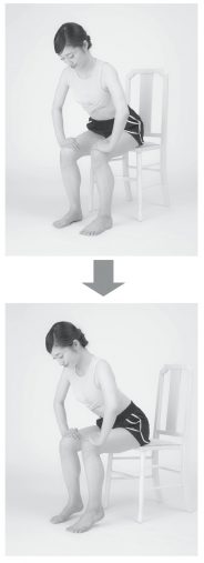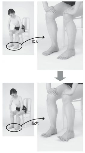 足幅を少しあけてイスに座り、指をめいっぱい開く。次に、親指の付け根、小指、かかとを床に着けたまま、そのほかの足の指を床から浮かせる。