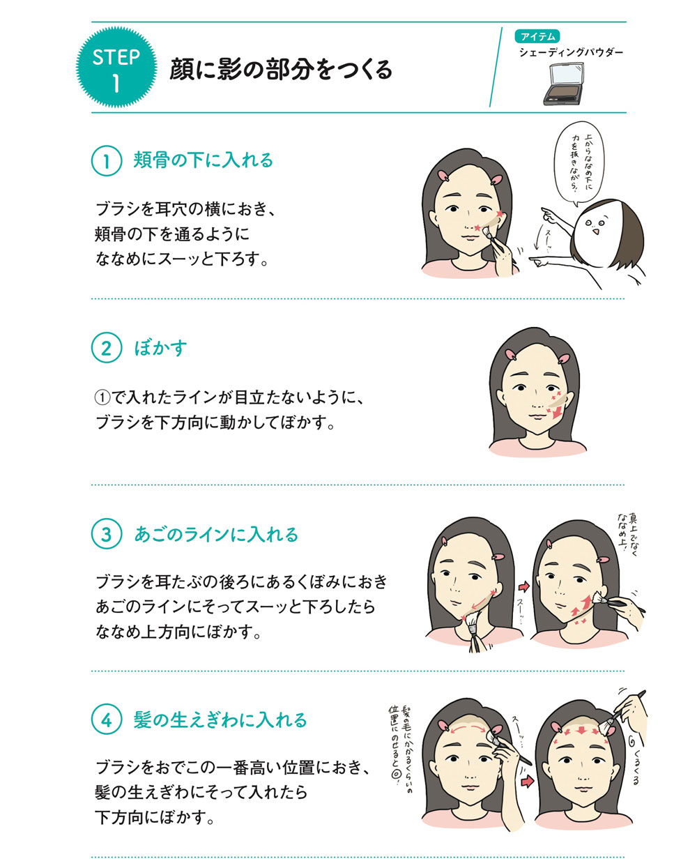 自然な立体感を出すポイントは、自分がもっている元の骨格を生かすこと。そのため、入れる位置は顔タイプによって異なりますが、今回は基本の動きをお教えします。