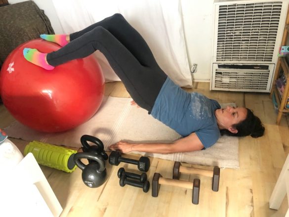 2)ヨガマットに仰向けになり、バランスボールに脚を乗せてヒップを上下にゆっくりと動かす。腹筋、背筋、大腿四頭筋などが鍛えられます。また、座りすぎで凝り固まった下半身の筋肉をほぐし、滞った血流もスムーズに流します。