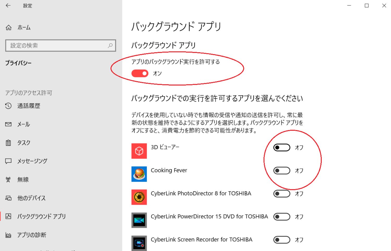 ①表に見えなくても背後でソフトが動いていることもあります。もちろん、処理能力を取られてしまうので、『設定』の『プライバシー』から『バックグラウンドアプリ』を開き、不要なアプリをオフにしましょう。