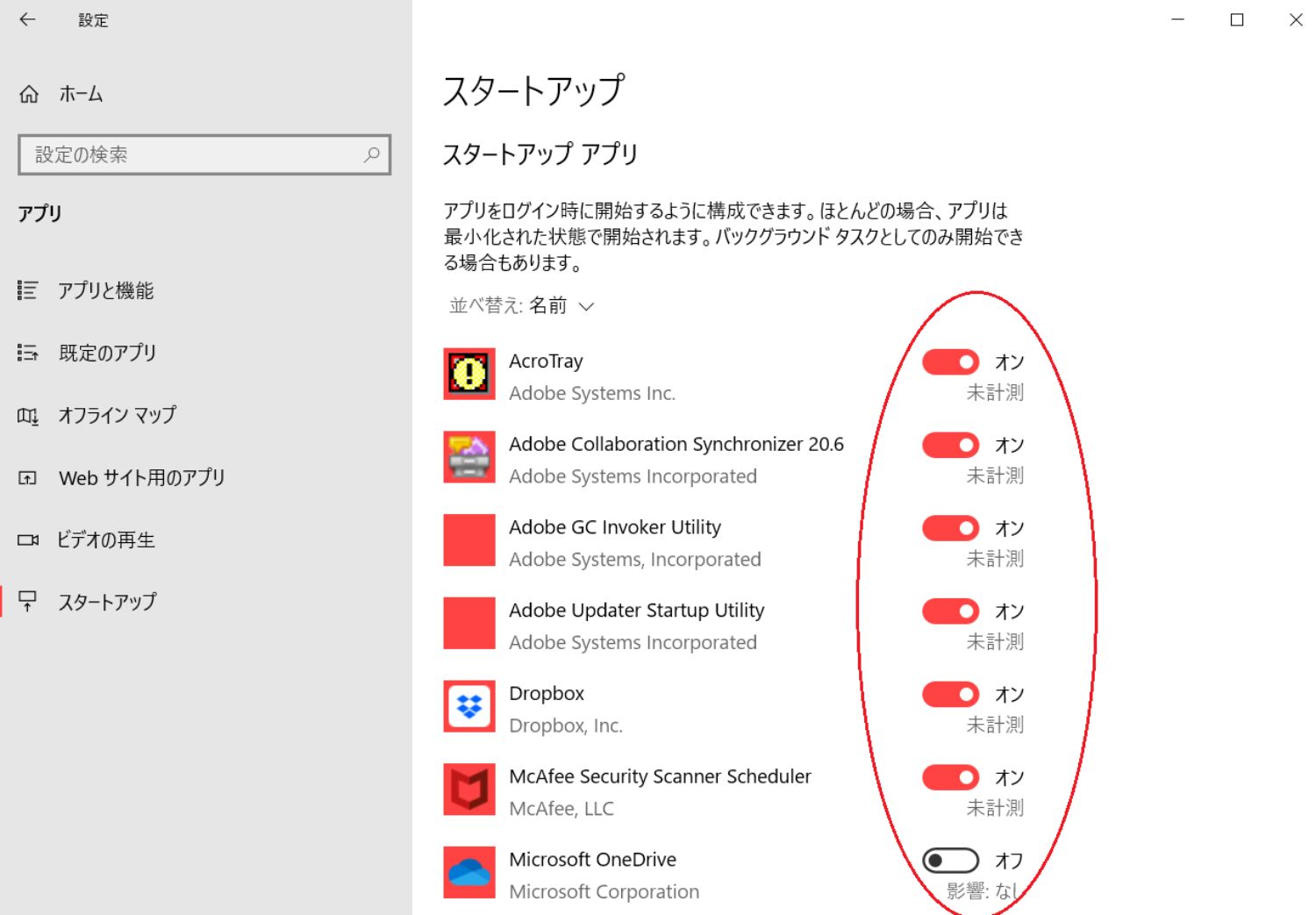 ③PC起動時に、自動実行されるアプリが多いほど、時間がかかります。『設定』の『アプリ』から『スタートアップ』を開き、不要なアプリのスイッチをオフにしましょう」