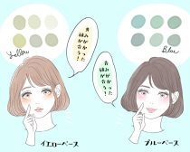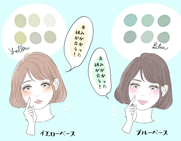 パーソナルカラーは基本的に、春・夏・秋・冬の4つの季節タイプに分けられますが、そこまで詳しく知らなくてもOK。肌の色みがイエローベース(黄みがかった暖かみのある肌色)か、ブルーベース(青みがかった透明感のある色)かで取り入れるくすみグリーンを分けると良いです。