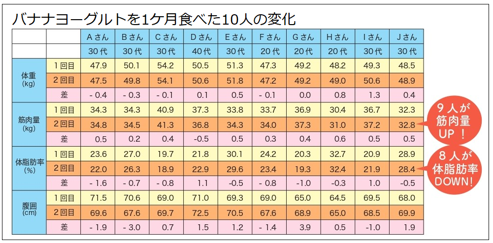 小林先生の監修のもとで、女性10名に朝食にバナナヨーグルトを1ケ月摂ってもらい、体の変化を調査したそうです。その結果は――。