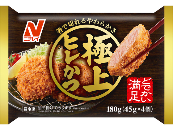 山本「2020年の春に新発売された商品の中で人気ナンバー1。1個45gのヒレカツが4個もどーんと入っています。レンジ調理なのに、サックリとした仕上がり、しかもお肉が箸で切れるほどのやわらかさ。そのヒミツは、お肉を丁寧にスジ切りして一晩寝かせるという、とんかつ屋さんの技を再現しているから。さらにサックリやわらかい食感の衣は、形状の異なる2種類の生パン粉を使って表現しています」