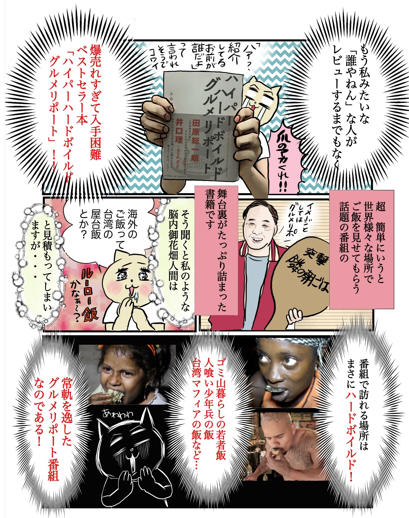 一方、上出さんの『ハイパーハードボイルドグルメリポート』では、“ヤバい世界のヤバいやつらのヤバい飯”をテーマにした「自称グルメ番組」の裏側や、番組本編に収まりきらなかったエピソードが多数収録されています。
