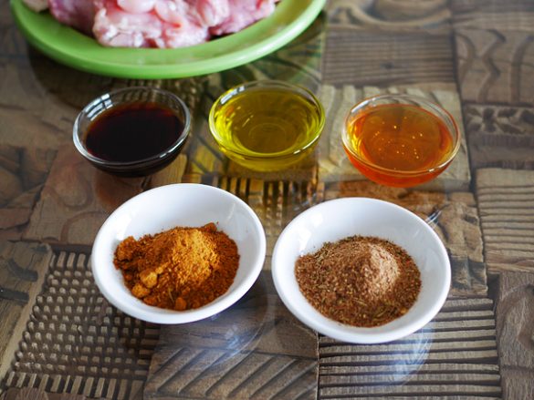 スパイスチキンを柔らかく香ばしくジューシーに焼くコツは、下味の調合にかかっています。今回は、日本人の舌に馴染みやすい味付けとして、醤油(肉の保水性を高める)、ハチミツ(タンパク質の熱凝固を遅らせる)、油(水分の蒸発を抑制する)を使います。