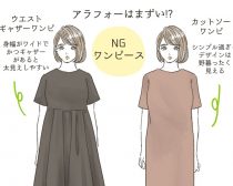 これと同様にもう一つ注意したいのが、最近よく見かける「カットソーワンピース」。シンプルなデザインだけに一反もめんのような間伸びした印象を与えやすいです。レイヤードや小物コーディネートありきで着こなしましょう。
