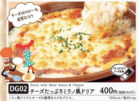 6位のチーズたっぷりミラノ風ドリアは、その名の通りミラノ風ドリアにチーズがかかった一品。こってりしたものが無性に食べたくなったときにチョイスしたくなります。カロリーはお高め(722キロカロリー)なうえに、数時間後には小腹が空くとわかっていながらつい食べてしまう魔性の食べ物です。