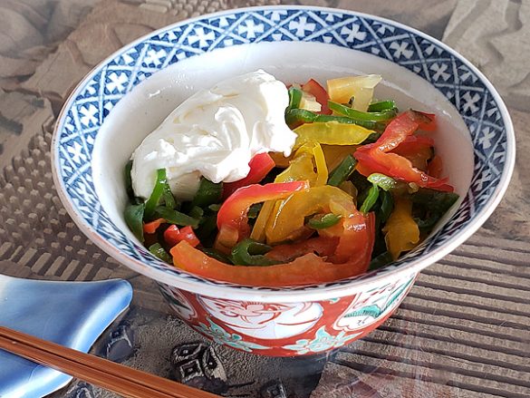 【レシピ①:カラフルピーマンとたくあんのマリネ~マスカルポーネ添え~】