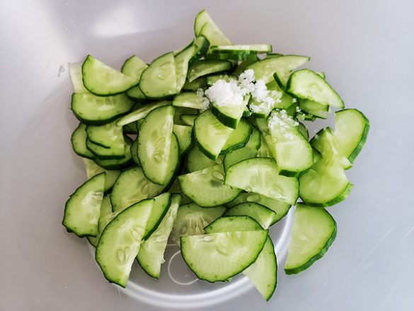 (1)半月切りに薄切りしたキュウリをひとつまみの塩を加えて混ぜ数分置く。水分が出てきたら水気を手で絞っておく。