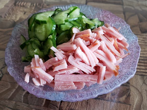 (2)ハムを千切りにして、キュウリと一緒に準備しておく。