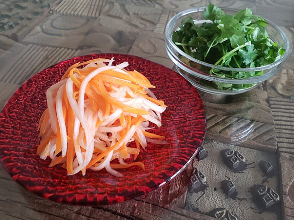 次に野菜。なるべくシンプルにすべく、王道の「なます」と「パクチー(香菜、コリアンダー)」にしぼりました。