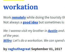 これは、仕事を意味する「Work」と休暇を意味する「Vacation」をかけ合わせた造語で、『アーバンディクショナリー Urban Dictionary』にも「Workcation」や「workation」の綴りで掲載されています。 リゾート地で仕事をこなしながら休暇を取る究極のリモートワークとして、アメリカなど諸外国で約10年前から使われ始めた言葉だそうです。 同じくコロナ禍のSNSでよく見かけるようになったものに、家や在宅を意味する「Home」「Stay」と「Vacation」をかけ合わせた「Homecation(ホームケーション)や「Stay-cation(ステイケーション)」があります。 こちらも「お金がないのでお家でバケーション」といった具合に使われる以前からある言葉のようですが、今年はアメリカでも感染対策で「在宅夏休み」を計画している人も多いようです。