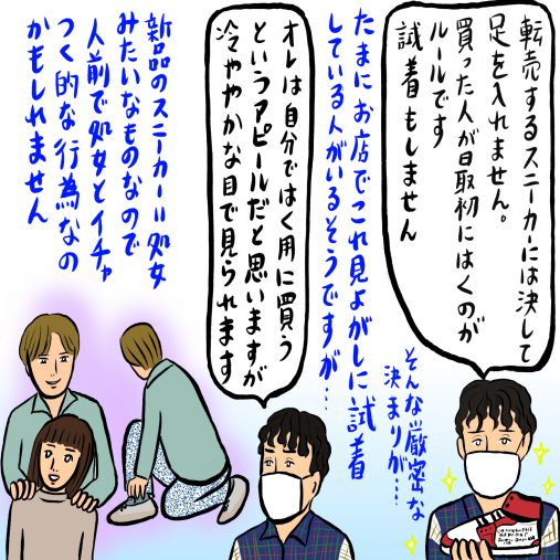 自分の観賞用以外に、転売する用の靴は新品のまま売るので決して足を入れないという不文律があるそうです。スニーカー好きは新品かどうかを重視する……処女を大切にする男性のようです。