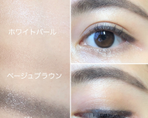 アイシャドウは、ほとんど分からないほどナチュラルな印象。のっぺりとした目元にならないよう、ホワイトパールをベースにツヤを出し、肌色と同じくらいのベージュブラウンをアイホールに広げています。