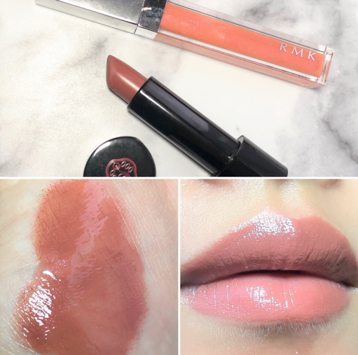 半沢花のリップメイクは、ヌーディなカラーにピンクを足した若見えするカラーを使っています。今回はベージュリップにピンクラメの入ったグロスを足して、ナチュラルなツヤを演出しました。(上の写真の下2つはどちらもリップ+グロス)