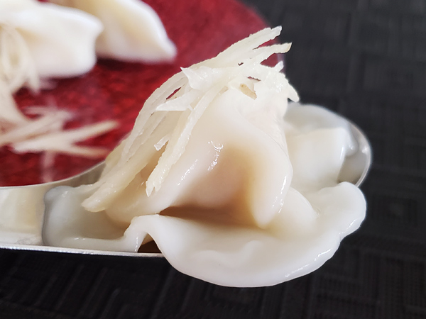 まずはじめにご紹介するのは、私が個人的に最も好きな組み合わせ。針生姜を乗せて黒酢をつけて味わう「小籠包」の世界観を水餃子で気軽に楽しむことができます。特にこの時期、柔らかくて食べやすい新生姜が旬で出回っているので、これを千切りにしてたっぷり添えると感動の味わいに。酢はお好みのタイプで良いですが、私のお気に入りはリンゴ酢。小籠包よりもあっさりしたテイストなので、黒酢よりもさっぱりフルーティーな酢がマッチすると思います。