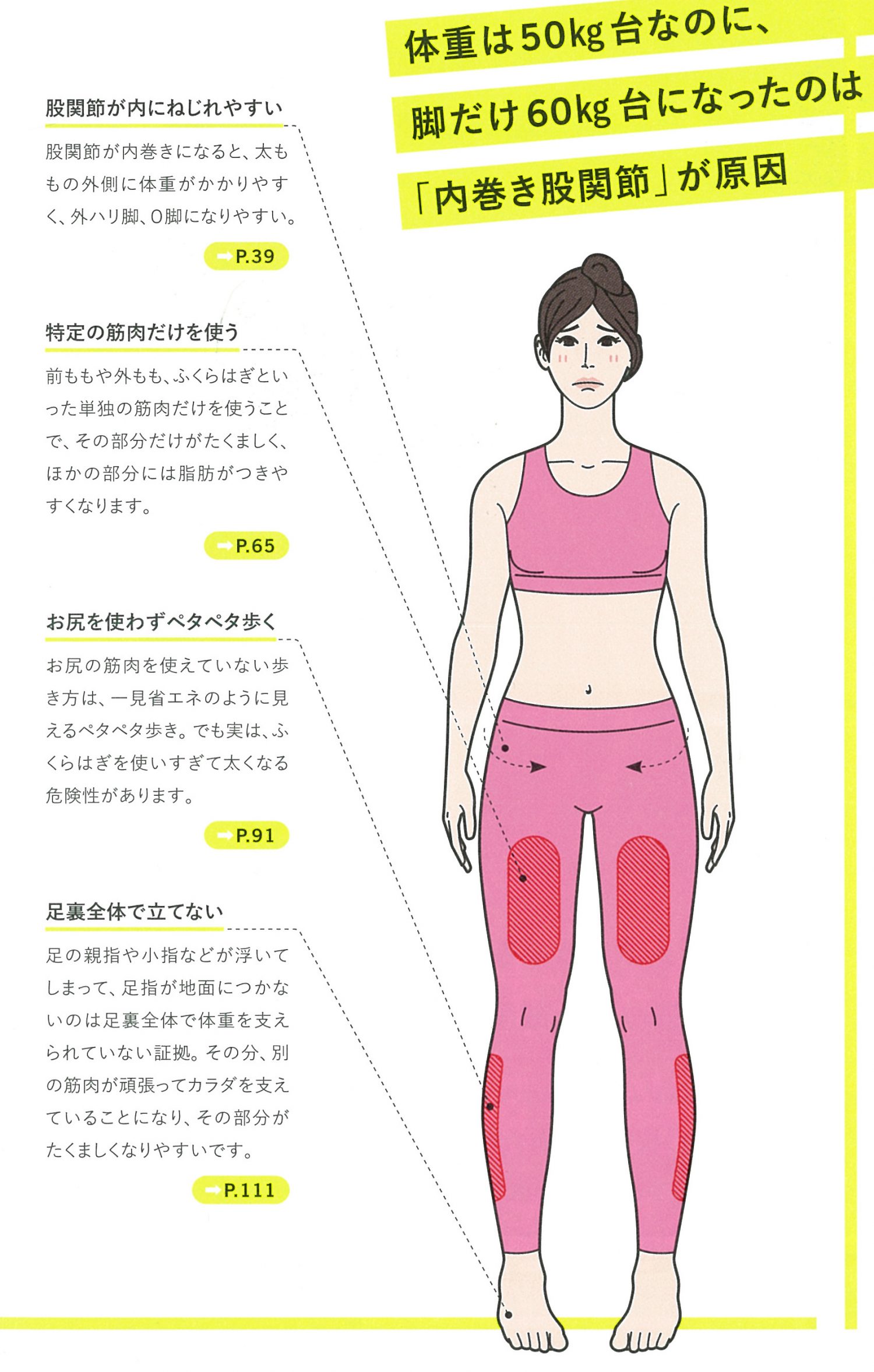 「股関節が内側にねじれ、重心が悪いと脂肪がつく」「内巻き股関節は実際の体重より多く見せてしまう」。さっそく、おそろしいことを指摘されました。この「内巻き股関節」自体、聞きなれない言葉ですが、足全体が内股になっていると考えればわかりやすいでしょう。この「内股股関節」による悪影響をまとめますと・・・