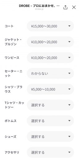 A:DROBEではお客様の予算額に合わせてお洋服を選定していますのでご安心を。アイテムのカテゴリー別に予算額を設定できるので、ご自身の予算額を当てはめてください。具体的に設定する事で、「高すぎ買えない」「チープでガッカリ」といったミスマッチを防ぎます。