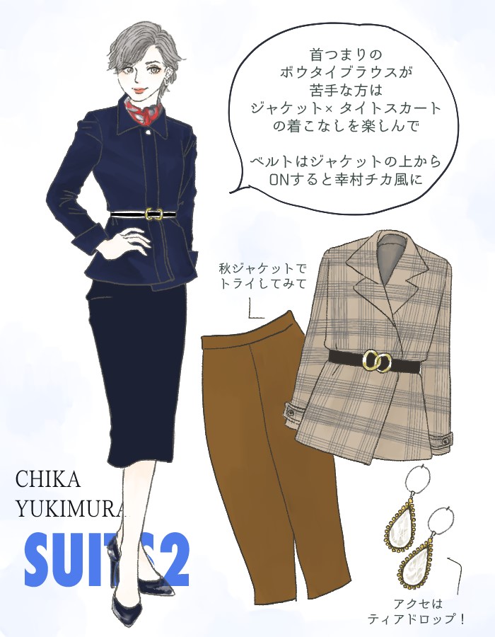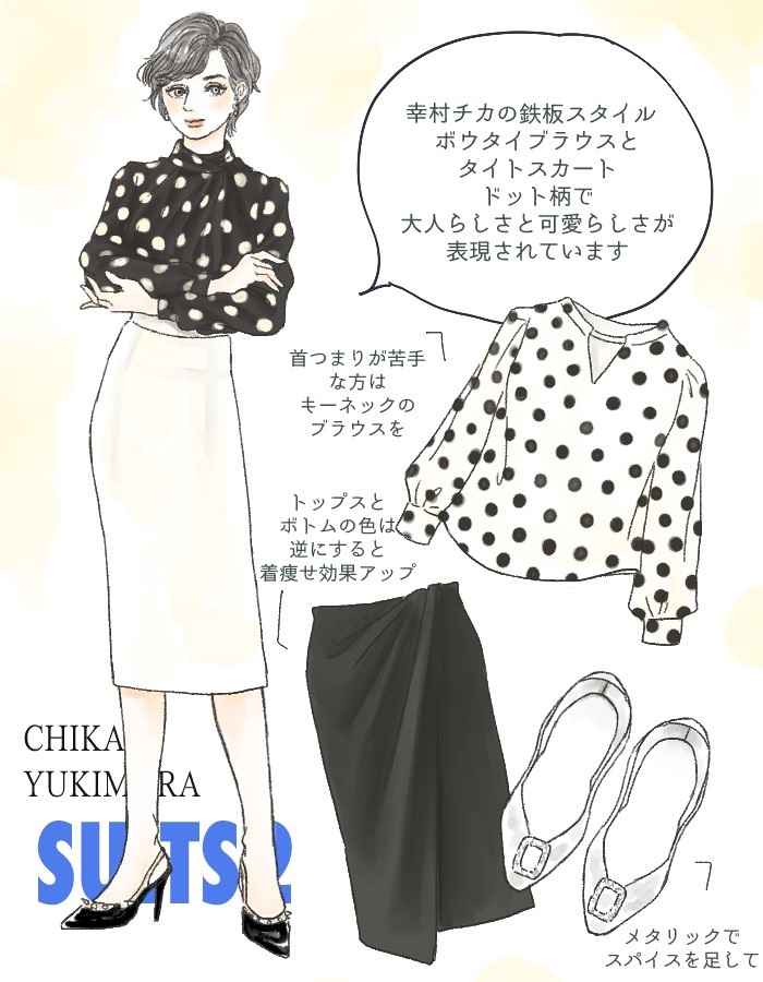 幸村チカといえば、ボウタイブラウスにタイトスカートというコーディネートが定着していますよね。おかげで、同じようにボウタイブラウスとタイトスカートをすればとくに何の意識をしなくても、幸村チカらしさが出ます。