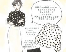 また作中で取り入れられている“柄”にも注目。幸村チカはモノトーンベースのお洋服が多く、柄はドット柄、チェック柄(ウィンドペンチェック)がとくに多いですね。とくに注目を浴びた第5話のドット柄のブラウスは非常に印象も強いので、ドット柄のブラウスにタイトスカートを組み合わせれば、それっぽい雰囲気を表現できます。その際、ボトムは白でも良いのですが引き締め効果のある黒タイトスカートに切り替えると着痩せ効果も期待できてオススメです。