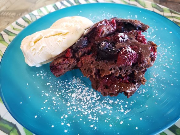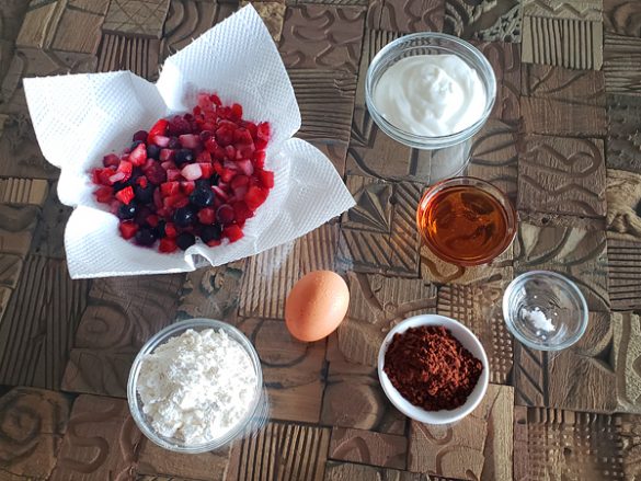 また、小麦粉は最低限の量にとどめました(今回は便利なホットケーキミックスを使用)。甘味料は、白砂糖より低カロリーで血糖値が上がりにくいメープルシロップを。主役材料としては、ポリフェノールたっぷりの冷凍ミックスベリーとココアパウダーをたっぷり使いましょう。