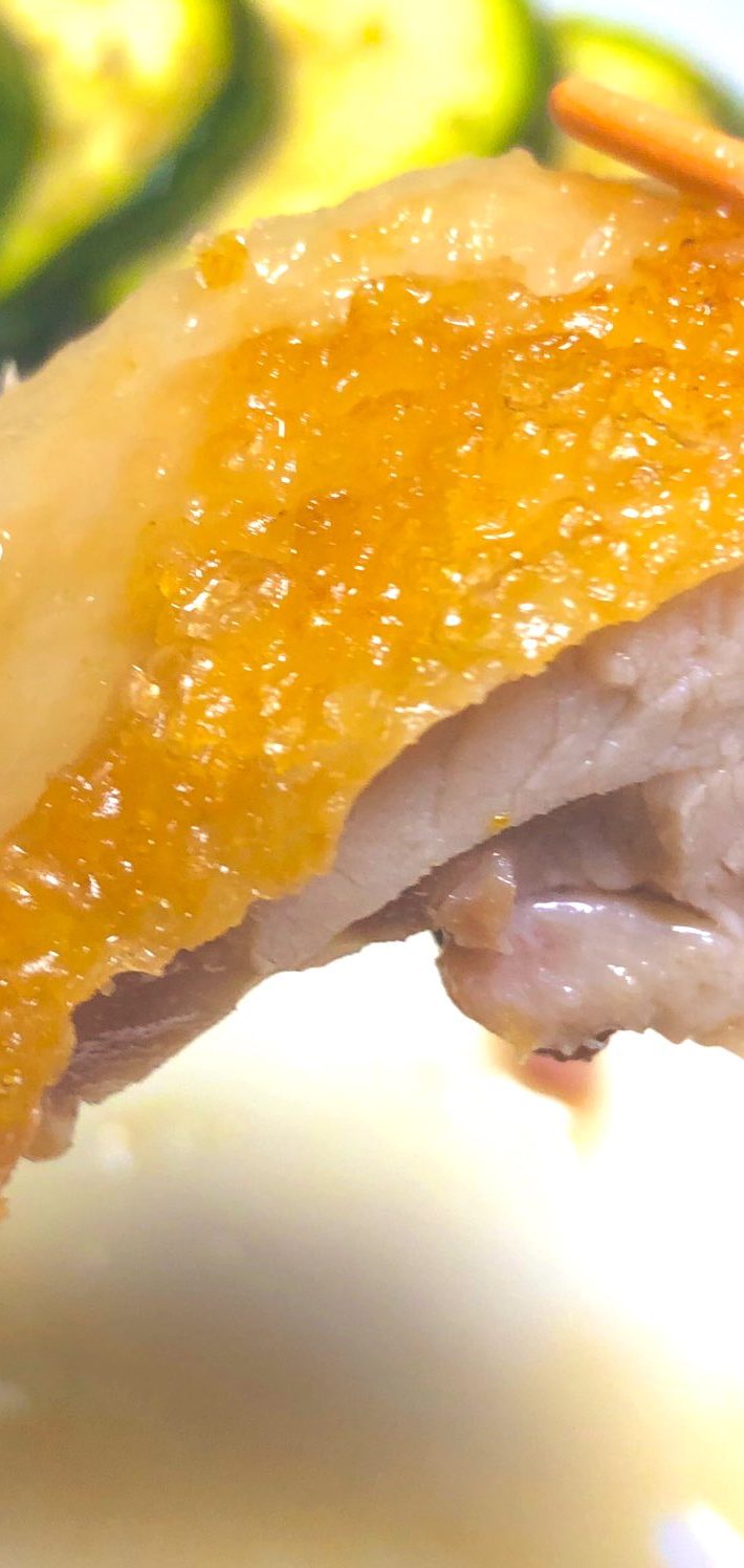 もも肉に重量の1%の塩をふり、キッチンペーパーで包んで2晩冷蔵してから焼くとパリッパリになるらしい