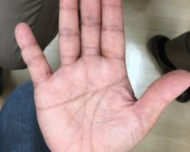 代表的な乾燥肌の手のひら写真を見せてもらうと、手のひらに縦線がビッシリ……! ちなみに筆者も花房先生に手のひらを見てもらったところ、「乾燥肌」と診断されました。