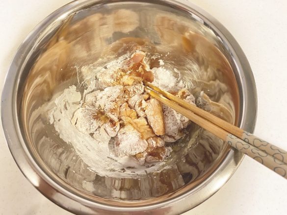 30分以上経ったらボウルに移し、片栗粉を投入して粉っぽさがなくなるまでよく混ぜます。そしてここでごま油も投入。