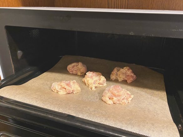 ネットや料理アプリで検索してみると、“揚げない唐揚げ”のレシピが数多くヒットします。どれも大体の作り方は、「一口大に切った鶏もも肉をポリ袋に入れ、そこへ調味料を入れて揉み込む→しばらく時間を置いて味をしみ込ませる→ボウルへ移し、片栗粉を加えて混ぜる→天板に並べ、オーブンでじっくり焼く」という流れ。油は片栗粉と一緒に混ぜるか、天板に並べた時に回しかける、または使わない、などさまざまでした。