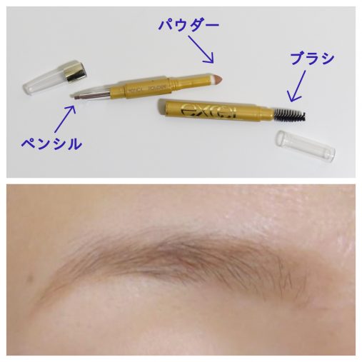 今回使用したのは「パウダー&ペンシル アイブロウEX PD10ピンクブラウン/エクセル(1,595円)」です。1本を分解すると、楕円型のペンシルとパウダーチップ、スクリューブラシが出てきます。