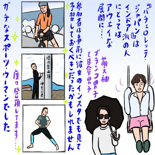 ワークアウトを乗り越えられる体力でないと、結婚した後、一緒にアウトドアの趣味を楽しめない、という意味もありそうです。体力での足切りが……。ワークアウト中、福田萌子氏もハキハキしたインストラクターみたいな口調になっていました。「辛い時が成長する時だよ!」と檄(げき)を飛ばしたり……。