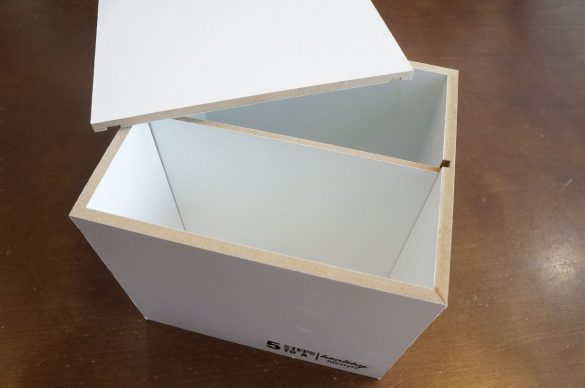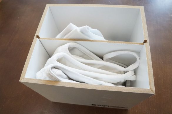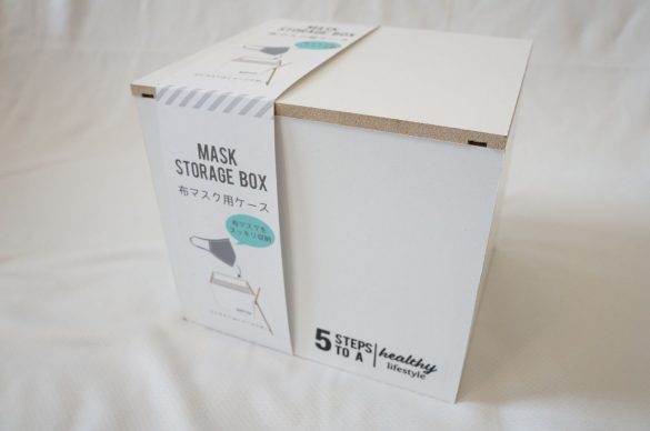 サイズ:高さ12.5cm×横14㎝×奥行12cm こちらは繊維板という木材でできたケースで、とても軽いのが特徴。自宅保管用のマスクケースですね。ふたがついているのでホコリをかぶることもなく、衛生的です。 箱の中はうすい仕切り板が入っています。サイズごとに分けて使ってもいいですね。立体型のマスクを折りたたんで保管可能