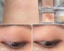 キャンメイクのアイシャドウは小粒・大粒のラメが入ったアイシャドウ、マジョリカマジョルカはパールが入ったアイシャドウです。キャンメイクの小粒ラメをアイホールのせるとギラギラとしてしまい、主張が激しい目元になってしまいました。