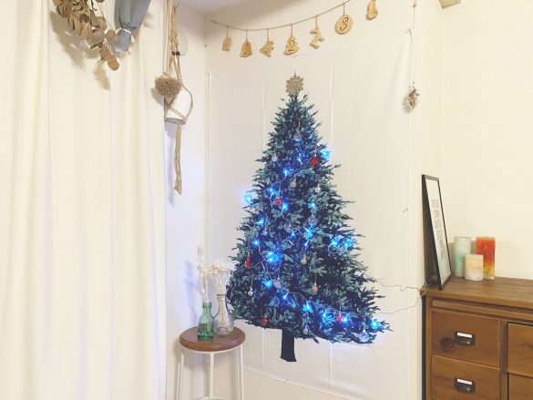 そんなクリスマスグッズの中でも最近密かに注目を浴びているアイテム、「タペストリーツリー」をご存知ですか? ファブリックツリーなどとも呼ばれるそれは大きな布地にもみの木の絵が描かれたもので、ツリーの代わりとして壁に飾ることができます。飾りつけも手軽なうえに省スペース、片づけも簡単とまさにいいことづくめ!ダイソーや3COINSでも販売しているため探してみたのですが、どこの店舗も早々と売り切れてしまったそうで人気の高さが窺えます。