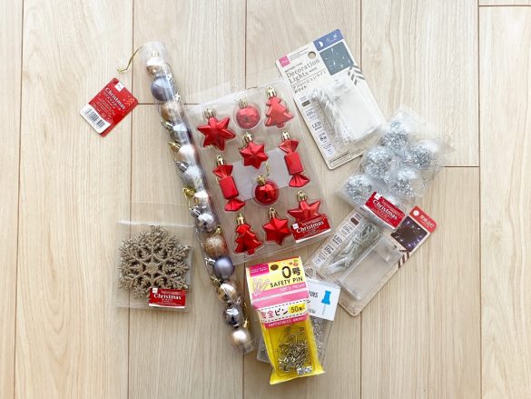 飾りはすべてダイソーで購入。100円とは思えないデザインの可愛いオーナメントがたくさんあり、選ぶのにかなりの時間を費やしてしまいました。画像に映っているものと同じデコレーションライトをあとからもう1つ買い足しましたが、それでも安全ピンと画びょうも含めて1,000円以下! タペストリーとオーナメント類で計2,000円ちょっとと、だいぶリーズナブルに揃えることができました。