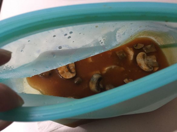 解凍ついでに、冷蔵庫にあったマッシュルームと豚肉のソテーも入れて湯せん調理。