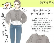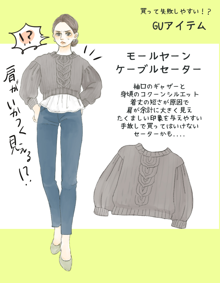 厚手のざっくり編みのセーターは冬コーデの必須アイテム! しかし、GUの「モールヤーンケーブルセーター」は、これこそ20代向けのカジュアルアイテムといった印象が強いですね。まず、肩にギャザーの入ったパフスリーブデザイン。ニットアイテムでパフスリーブとなるとかなり肩のラインがいかつく見えます。とくに肩幅が広い方は避けたほうがいいでしょう。