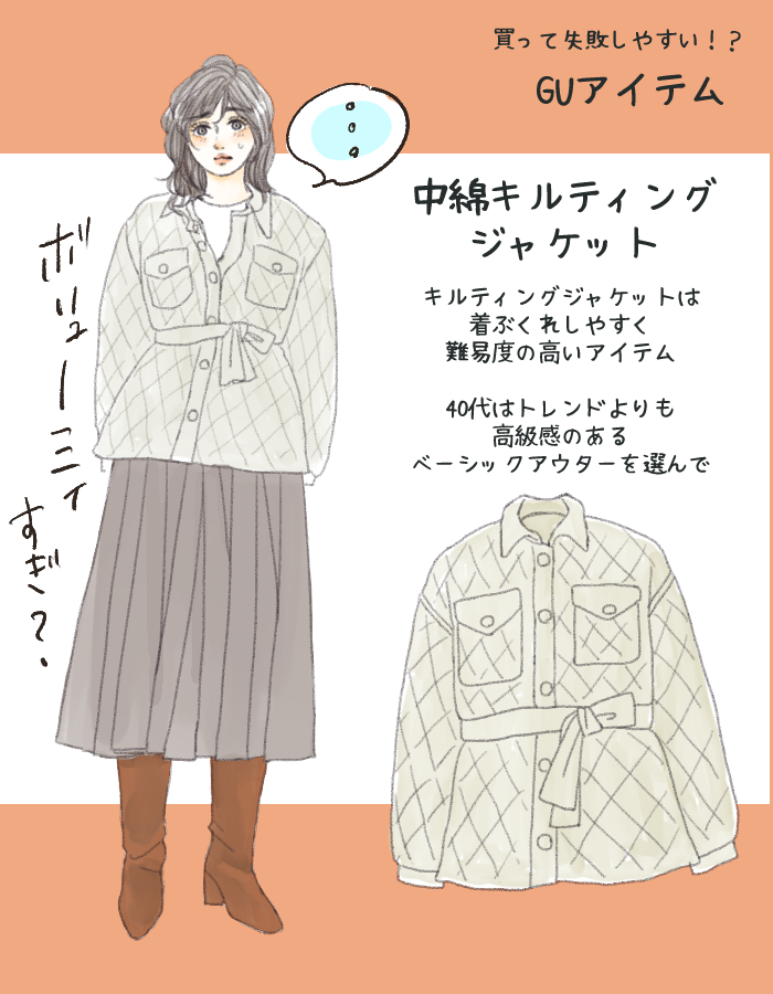 しかし、GUの新作で登場した「中綿キルティングジャケット」は正直いってかなり要注意。もともとキルティングジャケットは厚みのあるアウターなので、他のアウターと比べて着膨れしやすいです。なので、ジャケットのシルエットライン、使用している素材、生地の厚みといったディティールにこだわった製品でないと上品に着こなすのが難しいのです。