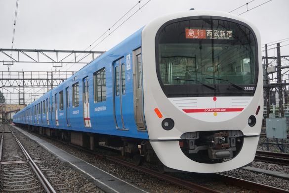 DORAEMON-GO!は、30000系スマイルトレインをドラえもんカラーのブルーでラッピングしたもので、車体前面と一部ドアがドラえもんのデザインで、走行している姿がなんともキュートです。運行区間は、新宿線、拝島線、多摩湖線(萩山~西武遊園地駅間)。