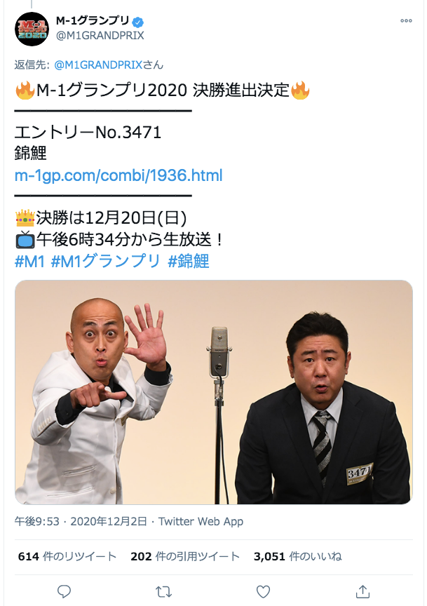 M-1グランプリさんTwitterを使っています-「🔥M-1グランプリ2020-決勝進出決定🔥-━━━━━━━━━━━-エントリーNo-3471-錦鯉-https-t-co-3nKSYQedMo-━━━━━━━━━━━-👑決勝