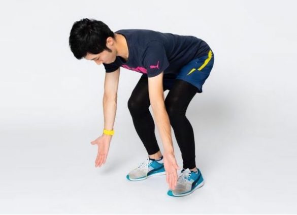 (1)足を肩幅に広げて軽く膝を曲げたら前傾姿勢をとります