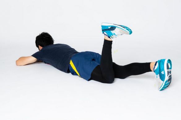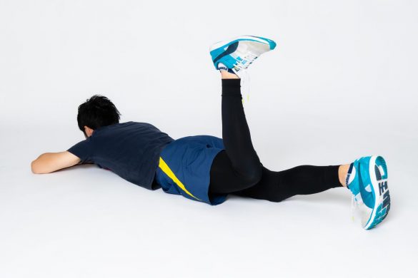 (3)お尻より後ろで脚を上げていきます。この時、お尻が絶対に後ろに傾かないように気をつけましょう。