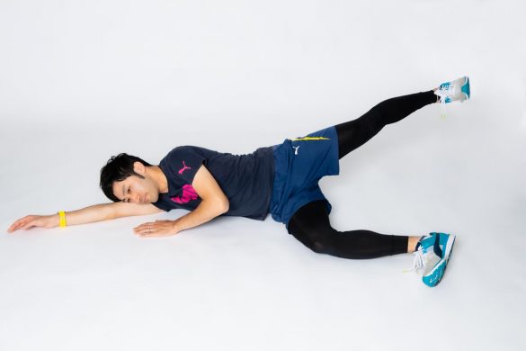 (1)横向きに寝ます(この時、動かす脚は身体のラインよりも後ろにあるように)。