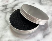 大きさは直径約8センチの手のひらサイズ。フタ付きなので、旅行やお泊りなど外出先に持ち運べます。中にある黒いスポンジは厚み約2センチです。取り出すことができ、片面が汚れたら裏返しにして両面使えますね。