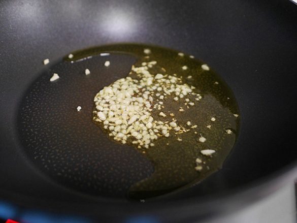 (2)荒くみじん切りにした玉ねぎを加えて黄金色になる程度に炒め、ベーコンを加えてさらに炒める。