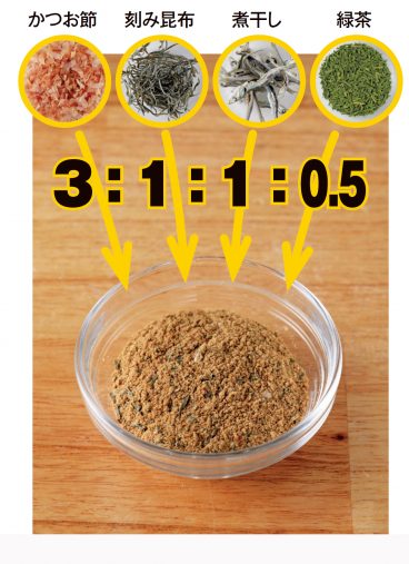 作り方はかつお節と煮干しを炒って水分を飛ばし、緑茶の茶葉、刻み昆布と一緒にミキサーにかけるだけ。割合はかつお節:刻み昆布:煮干し:緑茶を3:1:1:0.5。