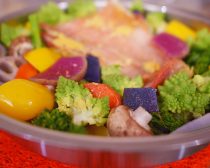 まずは野菜選びから。鍋料理に選びがちな野菜は一旦おやすみして、なるべくカラフルな緑黄色野菜(色の濃い野菜。ブロッコリー、パプリカ、菜の花など)やずっしりとした根菜類(人参、紫大根。レンコンなど)、きのこ類を意識的に選んでみましょう。ちょっと意識をするだけで、アンチエイジングに良いとされる抗酸化成分や、腸活に役立つ食物繊維の摂取量を増やすことができます。  今回集めた野菜は、菜の花、パプリカ、レンコン、ロマネスコ、紅芯大根、人参、マッシュルーム、シャドークイーン(紫ジャガイモ)、根パセリ。すべてスーパーで調達したもので、最近ではこのような珍しい野菜が身近になっているように思います。スーパー以外にも産直売り場などでもよく見かけるようになりましたから、いつもと違った野菜を楽しく探してみてください。さあそれではこれらの野菜をどうやって調理するかという話に移りましょう。