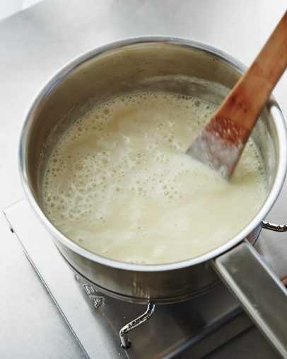 ②小鍋にAを入れ、軽く混ぜて5分ほどおく。豆乳を加えて混ぜ、中火にかける。沸騰したら弱火にし、ときどきかき混ぜながら3分加熱して火を止める。